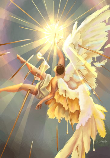 Dielo zobrazuje Ikara v dramatickom, paradoxnom okamihu jeho pádu. Ikarus sa vystiera smerom k žiarivému slnku, symbolu túžby a ambície. No namiesto nádeje sa slnko mení na prenikavý, ostrý bod, ktorý ho prebodol. Hoci jeho gesto smerom nahor naznačuje snahu vystúpiť vyššie, jeho telo sa už nakláňa do pádu, krídla, čiastočne poškodené. To, čo ho malo pozdvihnúť, sa stalo príčinou jeho zničenia a pádu.