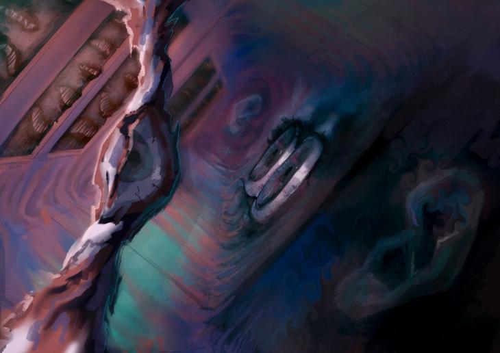 Abstraktné/fantazijné pretvorenie interiéru z reálneho života. Dielo je inšpirované surrealizmom a pocitmy úzkosti z preľudnených alebo úzkych priestorov. Oči a uši majú naznačovať nedostatok súkromia ich veľkosť, ale pomenší počet majú poukázať, že stačí málo na to aby sa v človeku vyvolala nepríjemná emócia ak sa to spája s ich skúsenosťami a fóbiami. Malé ústa predstavujú negatívne myšlienky- hoci jednoduché a často nezmyselné, ale sú vo veľkom počte, čím zaberajú celú stenu.